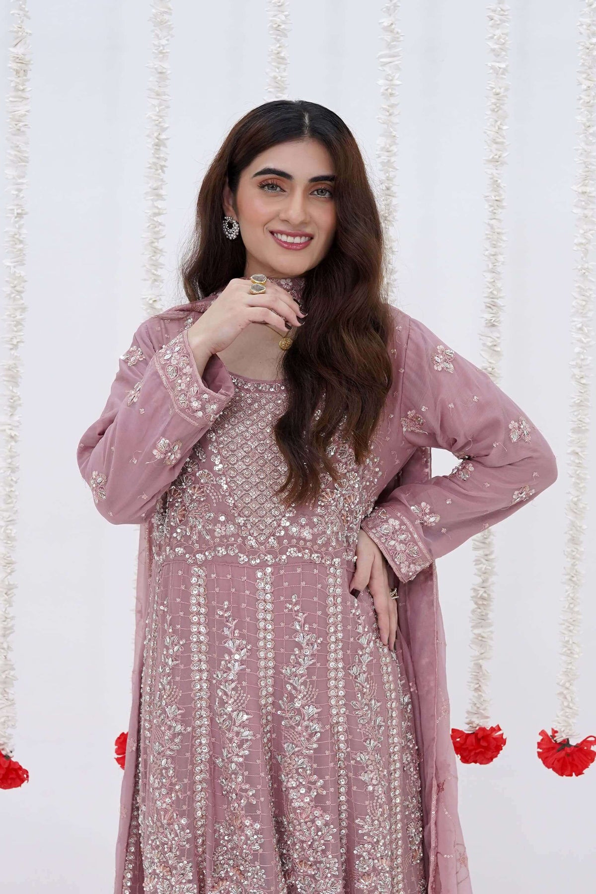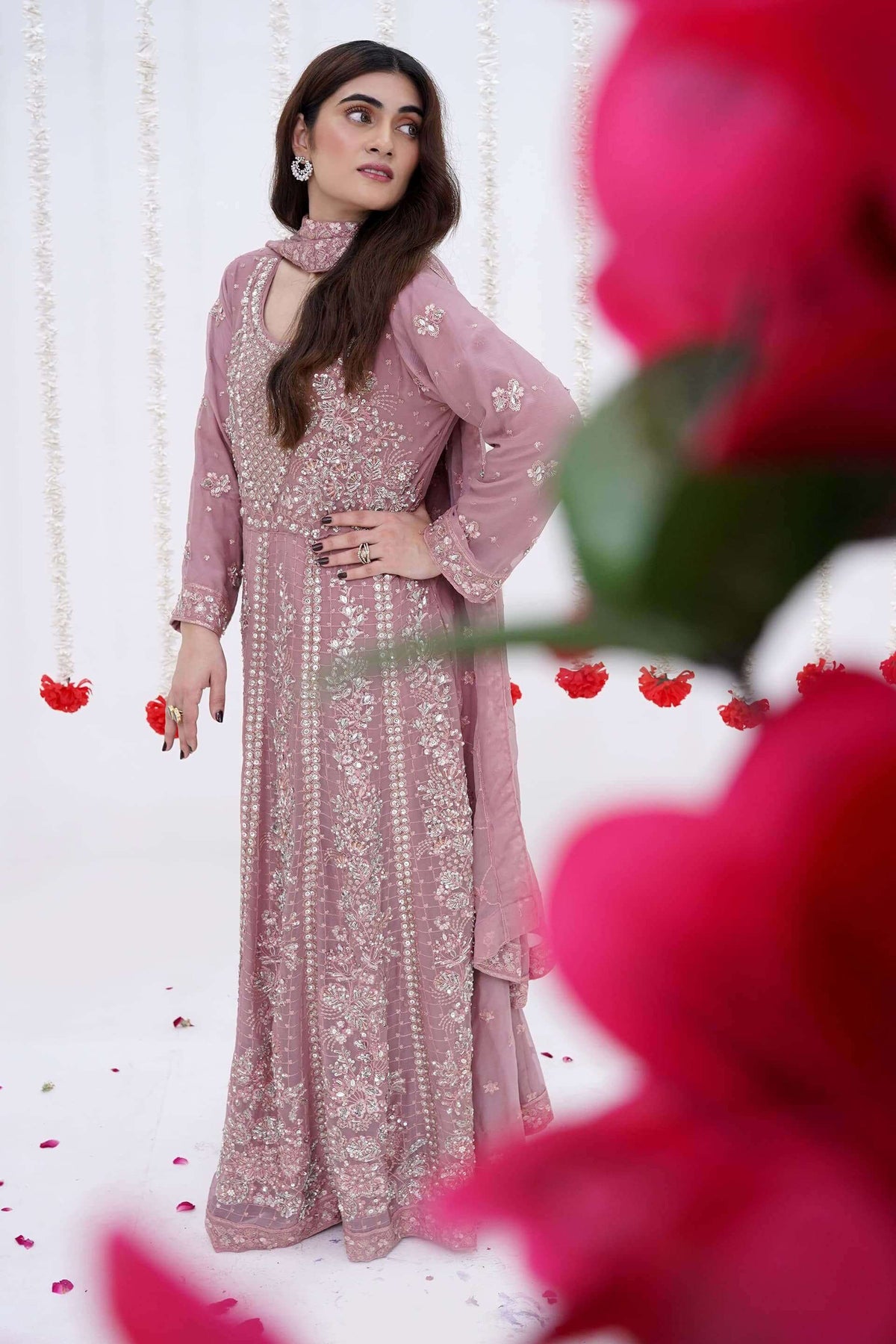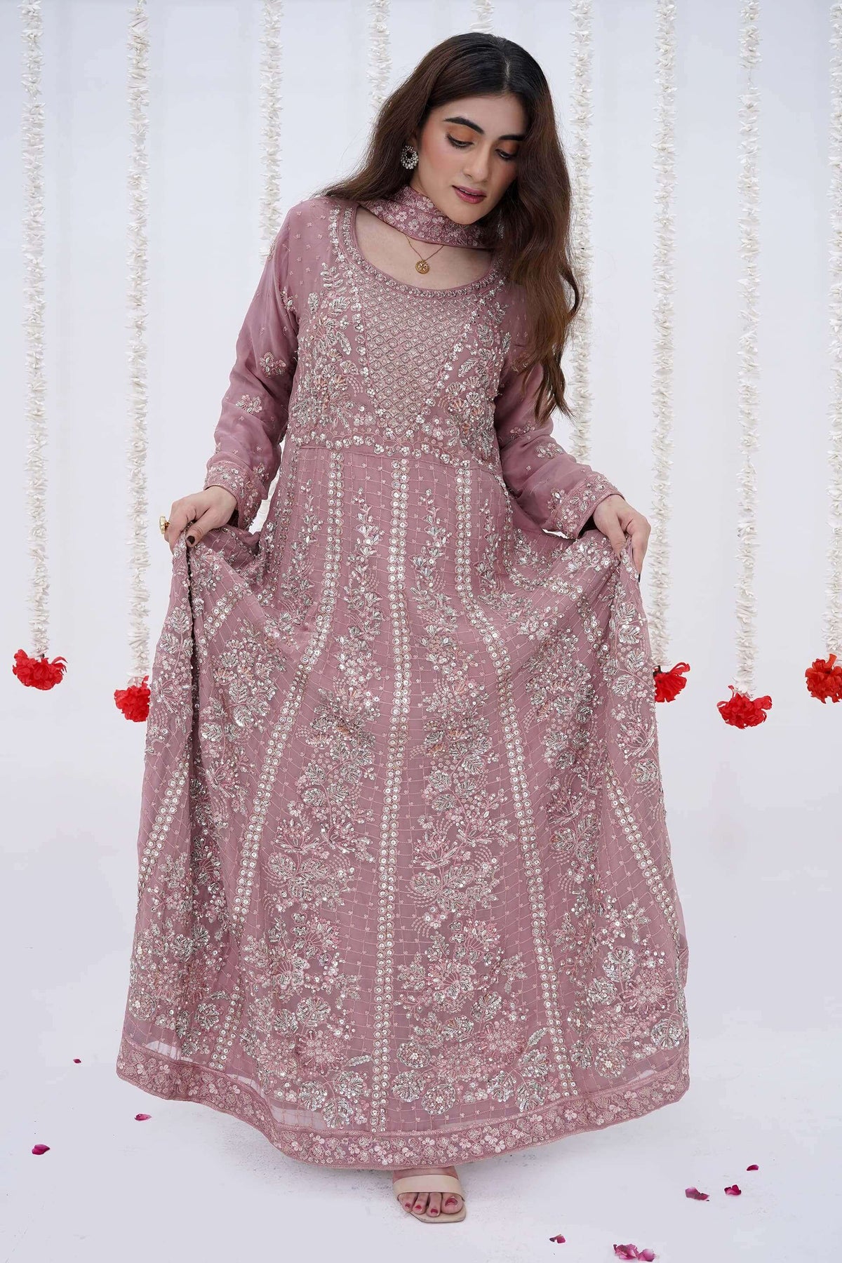 A sophisticated mauve chiffon maxi dress, designed with fine handwork for weddings, parties, and formal occasions. This elegant gown is part of our luxury dresses line, blending designer clothing for women with comfort and timeless beauty. A chic piece for women’s designer wear collections. Matching dupatta included.