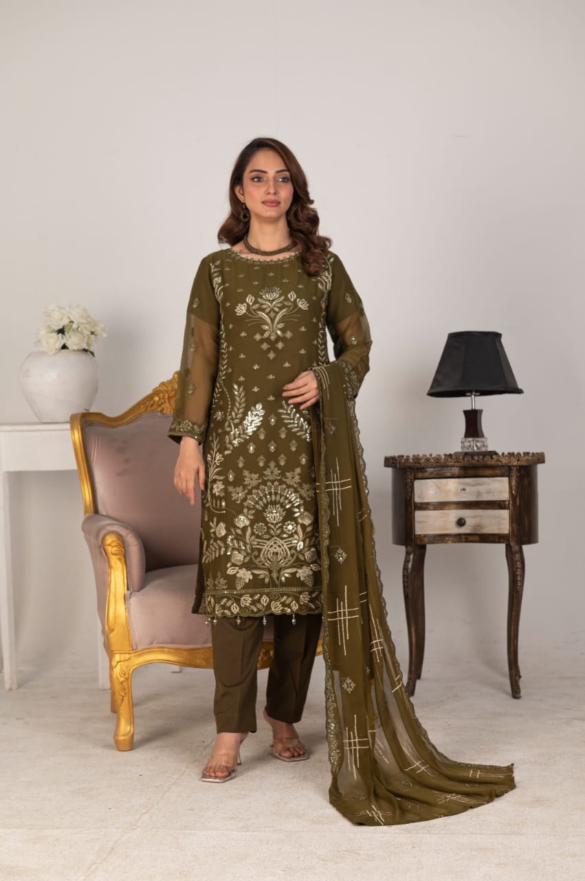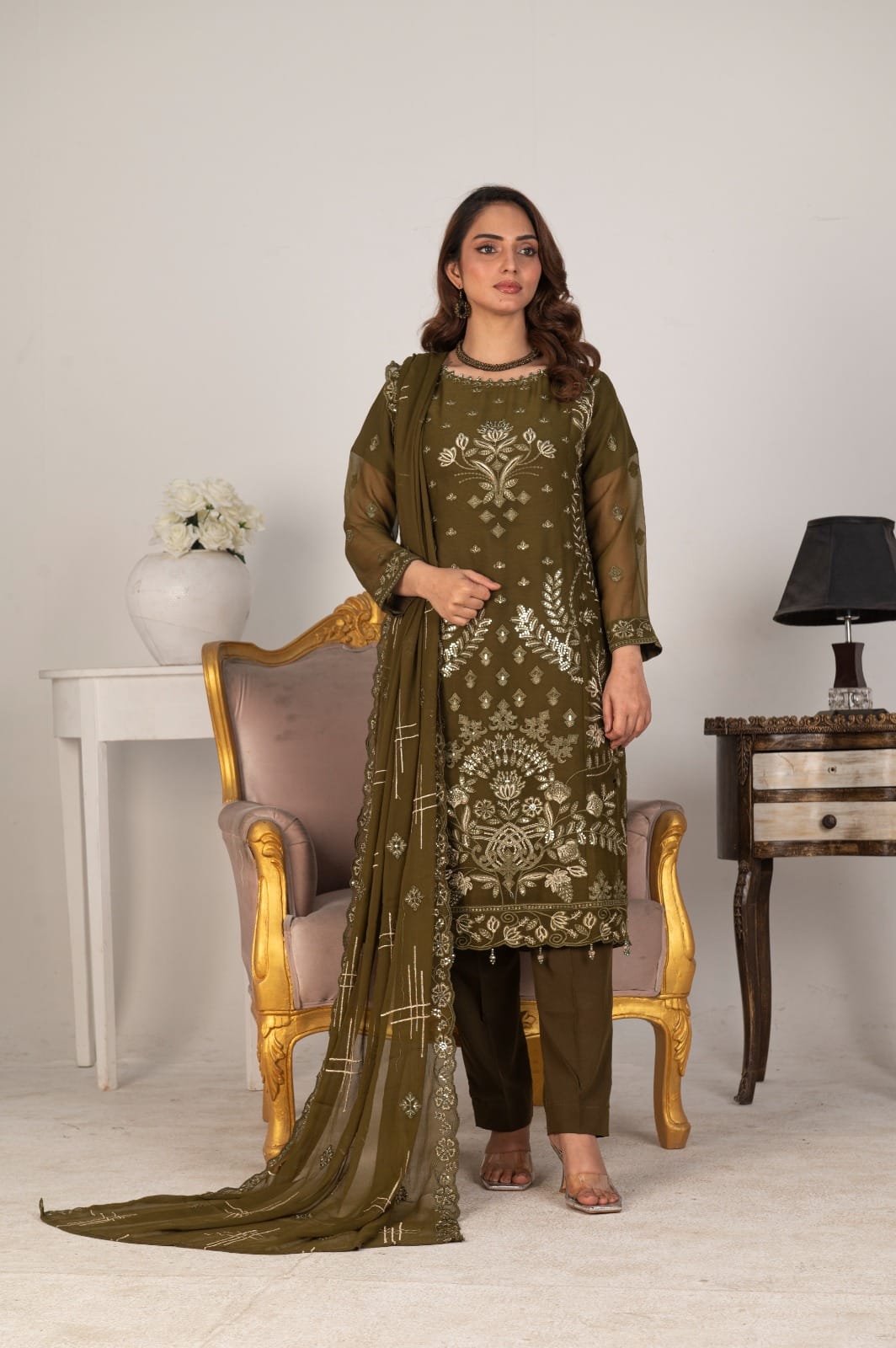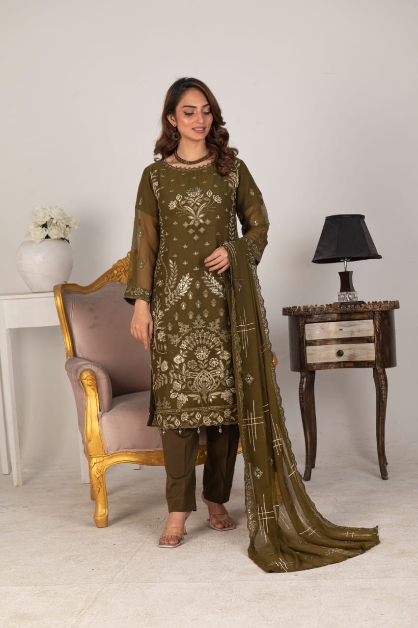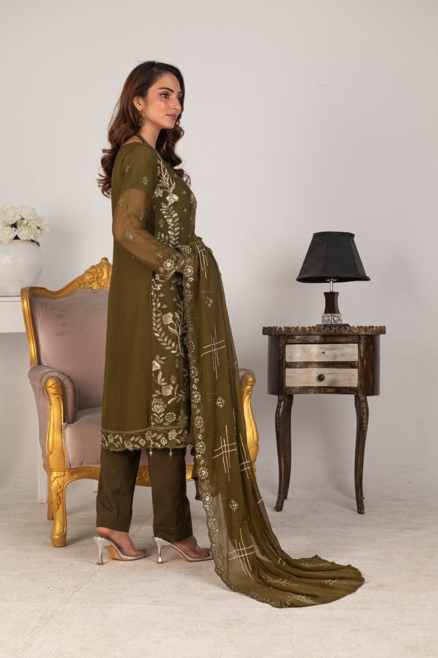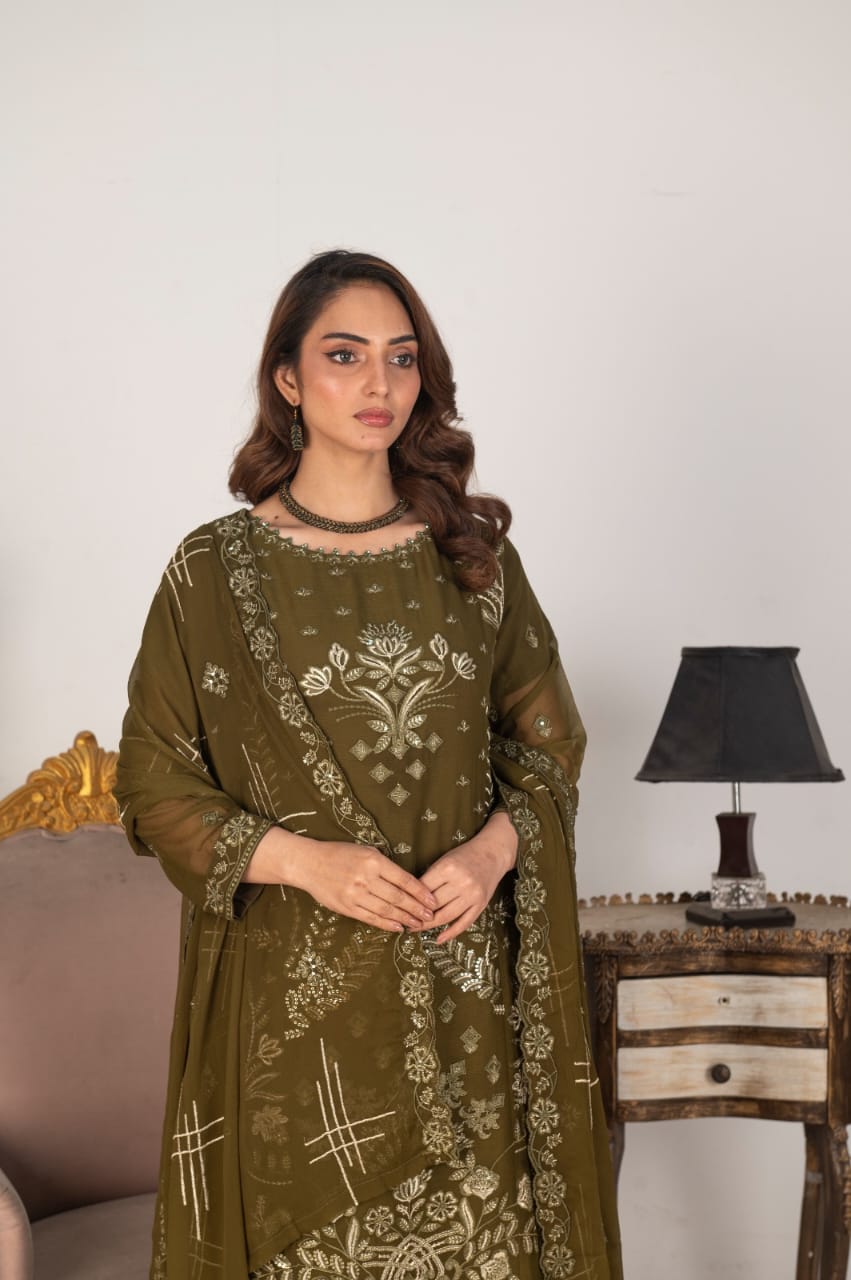 Olive Green Embroidered Chiffon Shalwar Kameez Suit