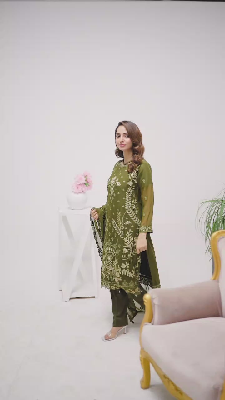 Olive green chiffon shalwar kameez with delicate embroidery. Modest, breathable, and perfect for weddings, Eid, and semi-formal ethnic events.