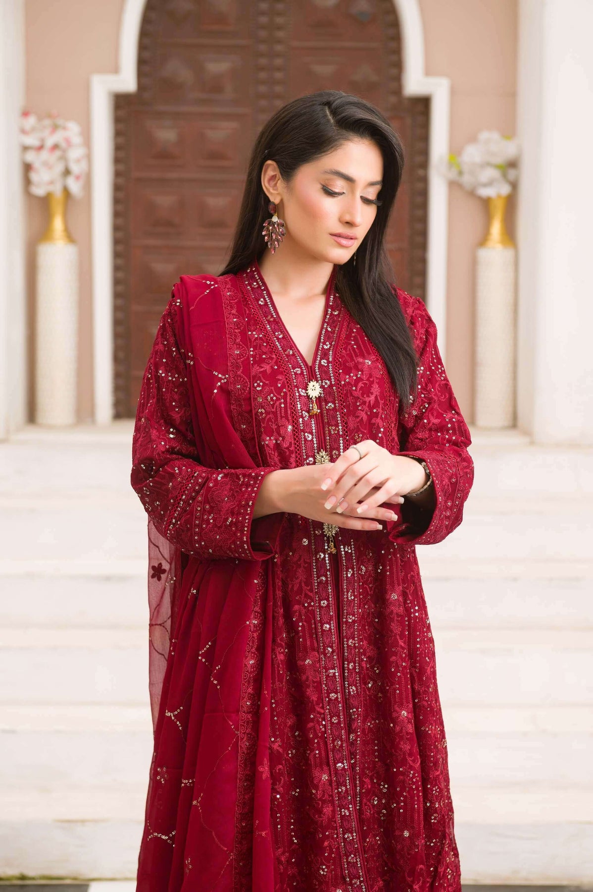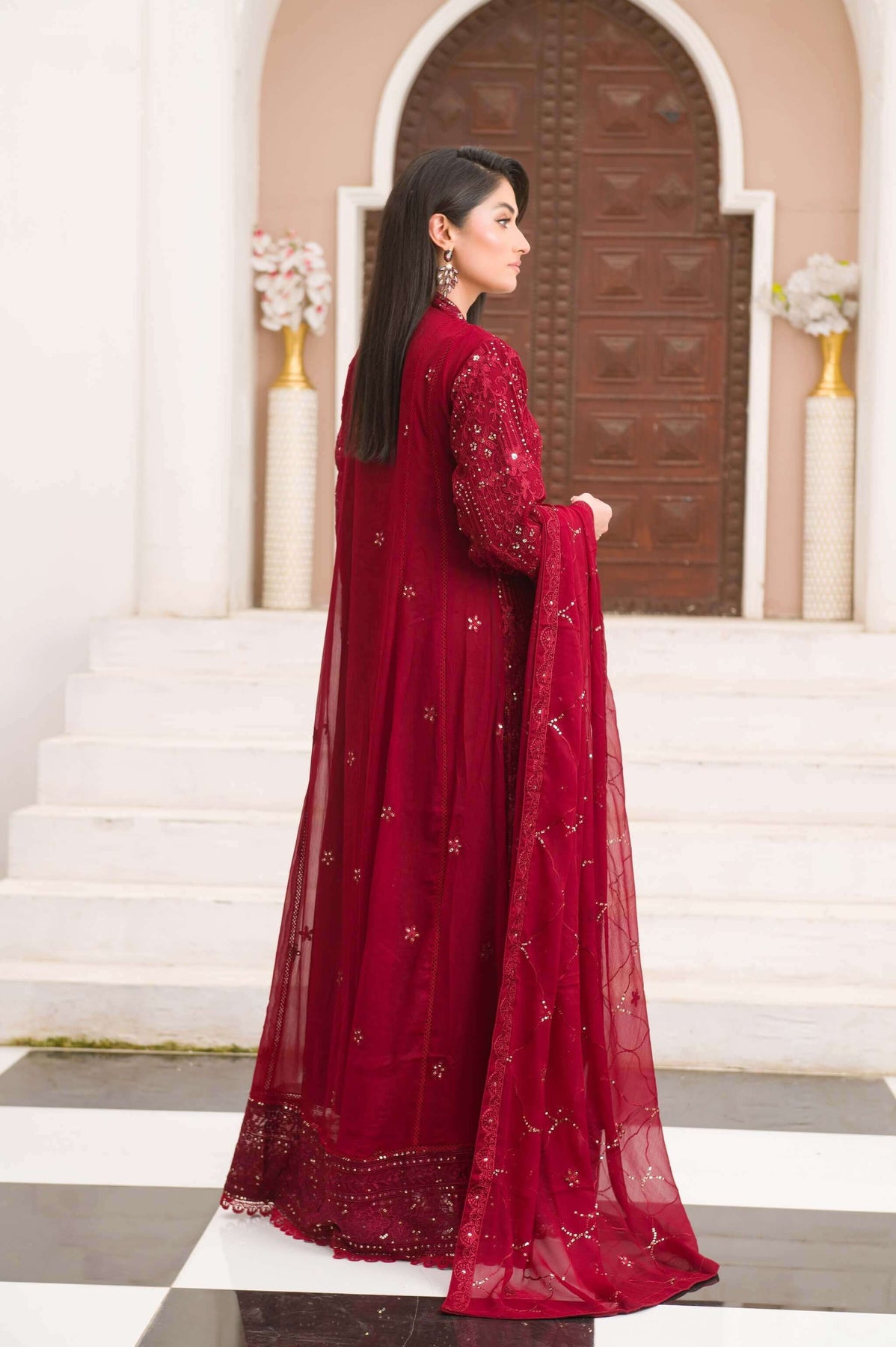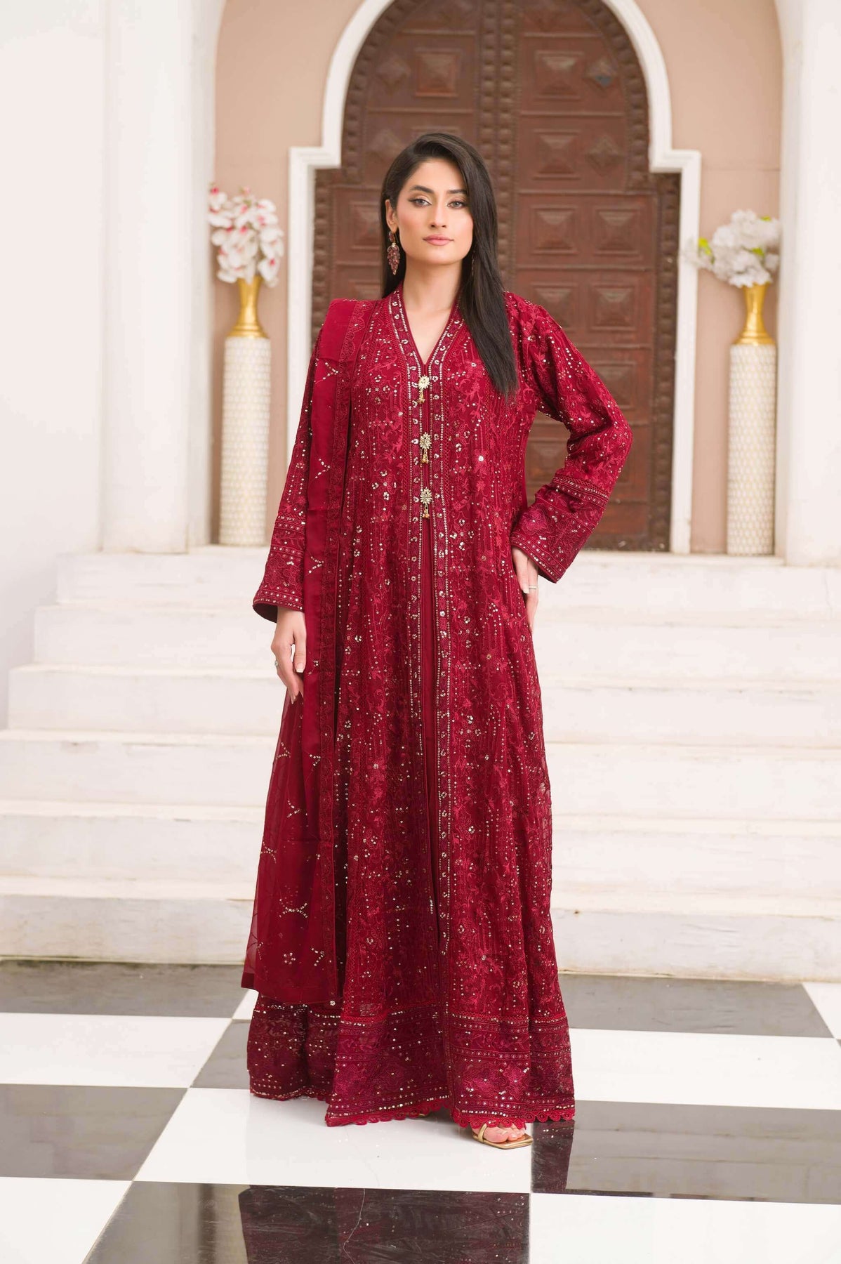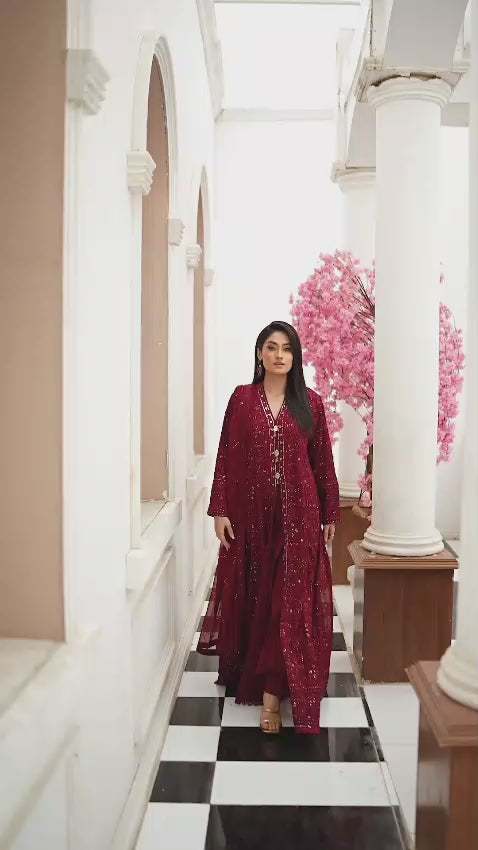 Maroon Anarkali Gown Chiffon Dress – Long Sleeve Elegant Party Wear Outfit