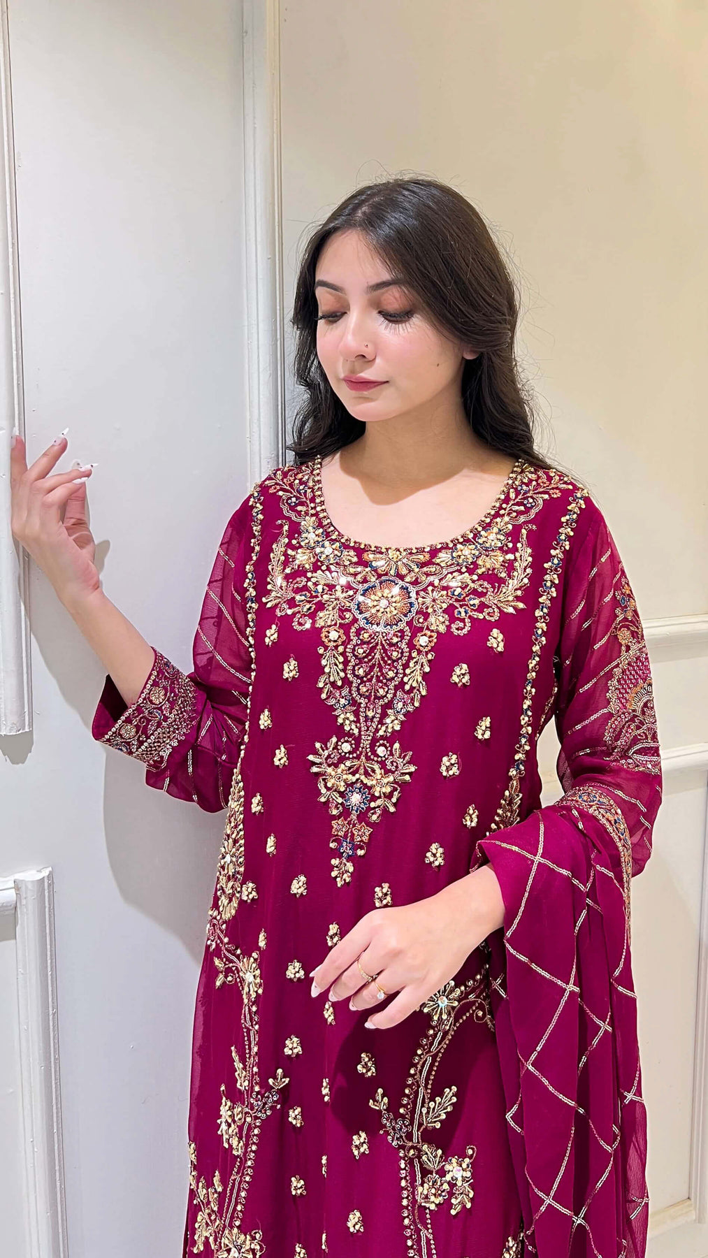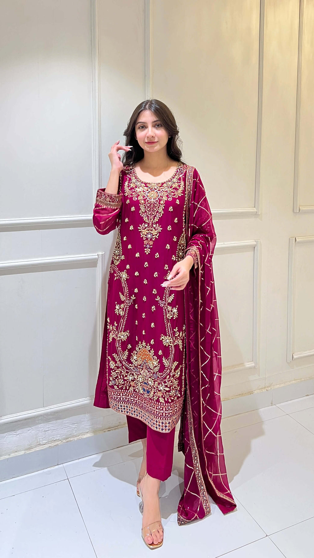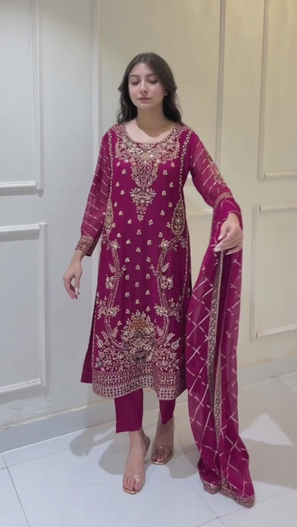 Magenta chiffon 3-piece shalwar kameez with hand-embroidered matching dupatta. Flowy and classy, ideal for weddings, festivals, and formal events. Perfect for women seeking premium Pakistani and Indian attire with elegant style.