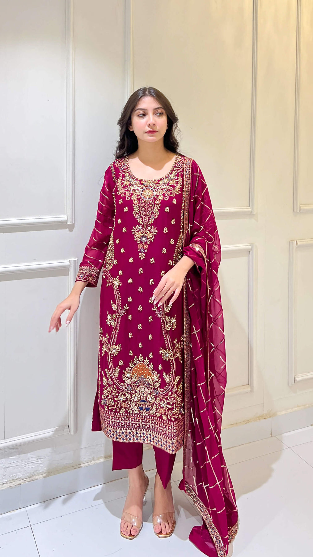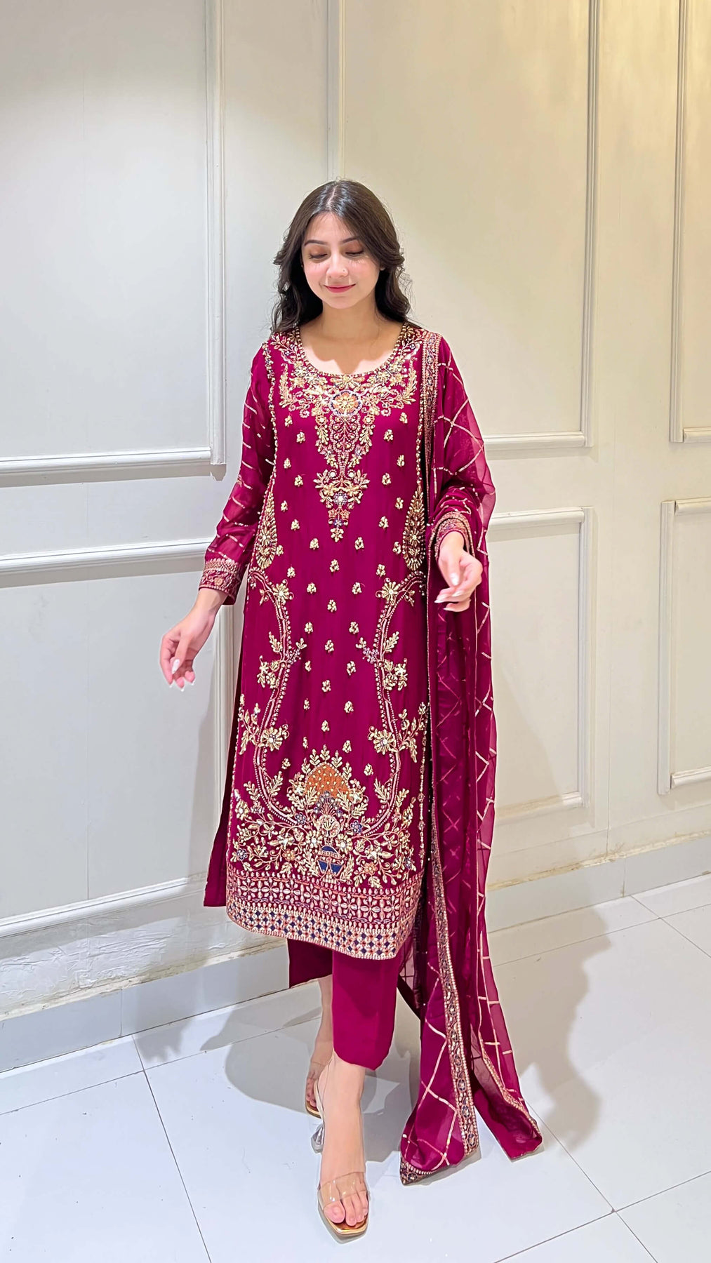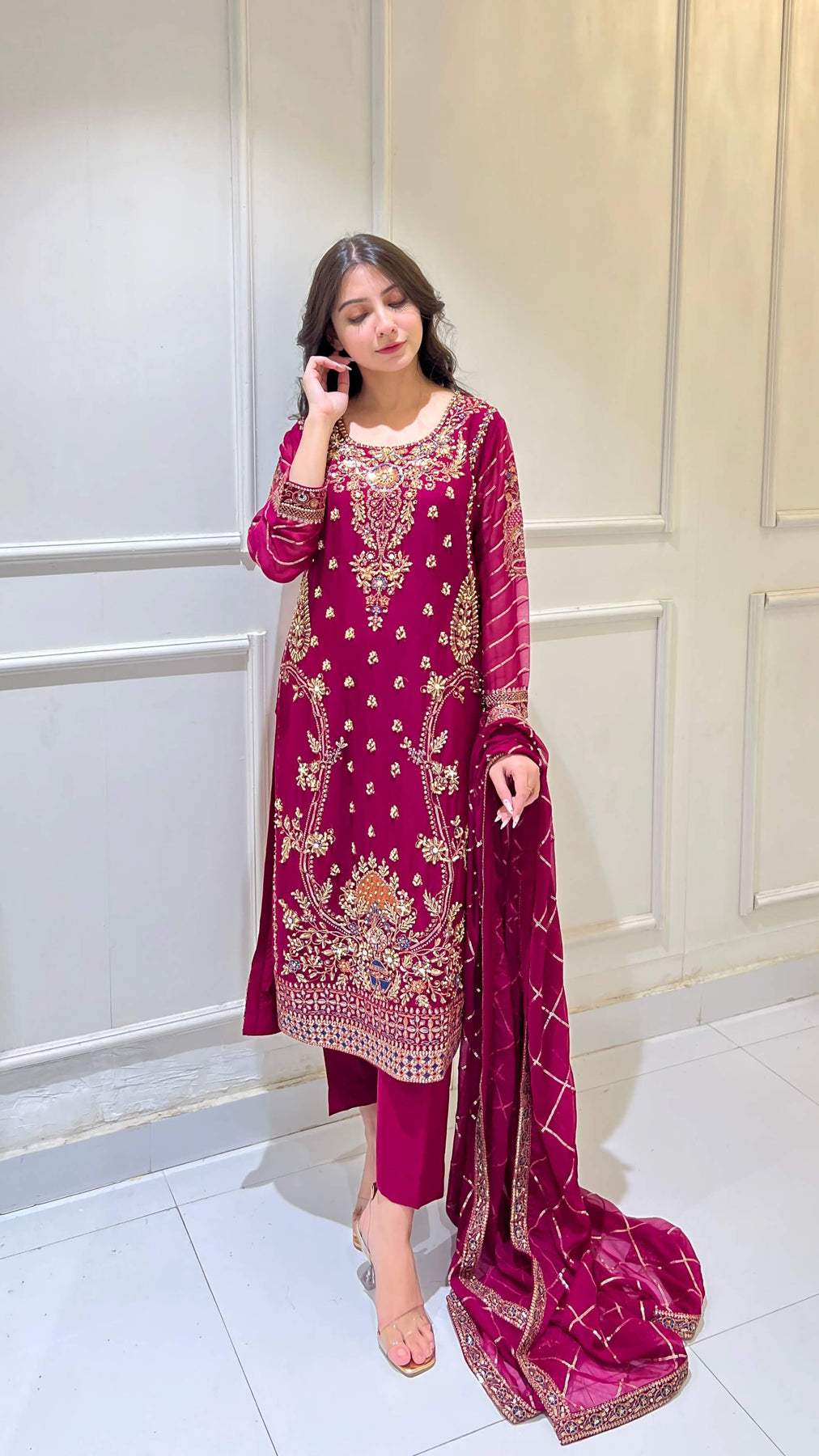 Magenta chiffon 3-piece shalwar kameez with hand-embroidered matching dupatta. Flowy and classy, ideal for weddings, festivals, and formal events. Perfect for women seeking premium Pakistani and Indian attire with elegant style.