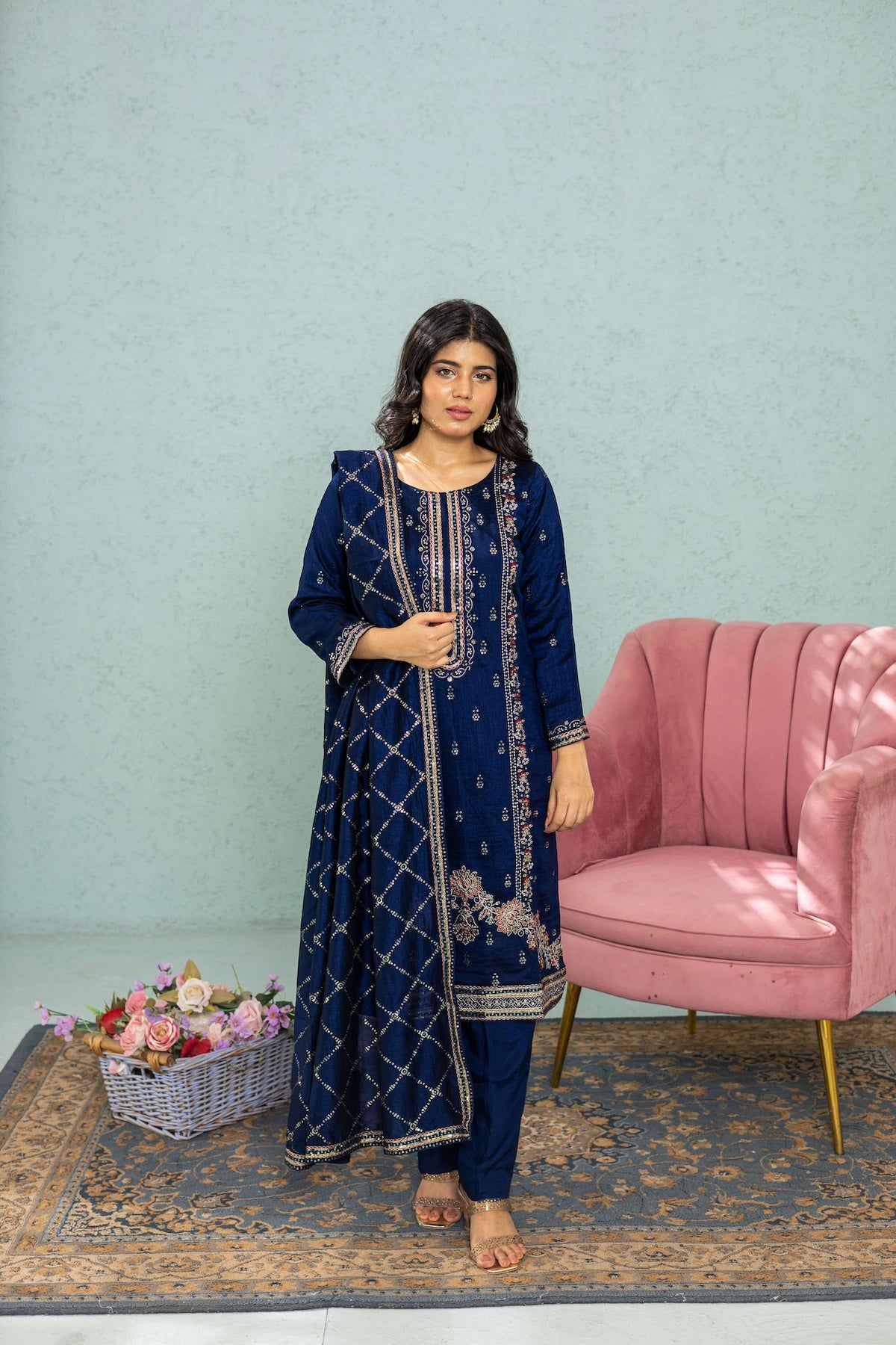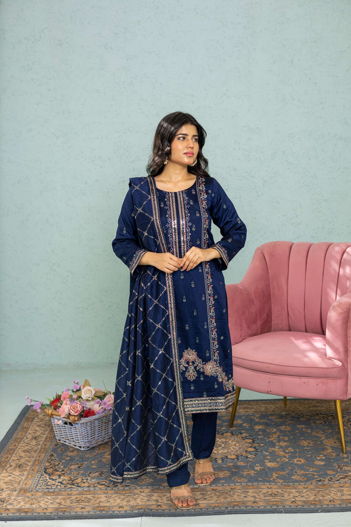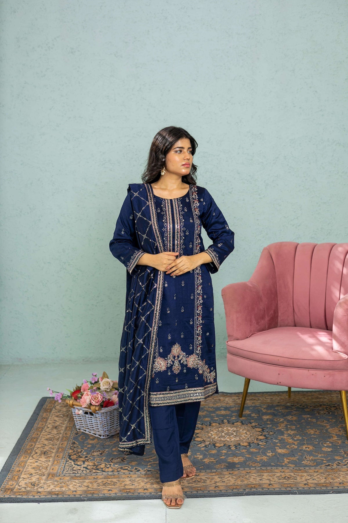 Navy blue 3-piece shalwar kameez in premium raw silk with intricate embroidery. Ideal for weddings, festive events, and formal occasions. This traditional Pakistani and Indian outfit offers timeless elegance and comfort for women seeking cultural attire.